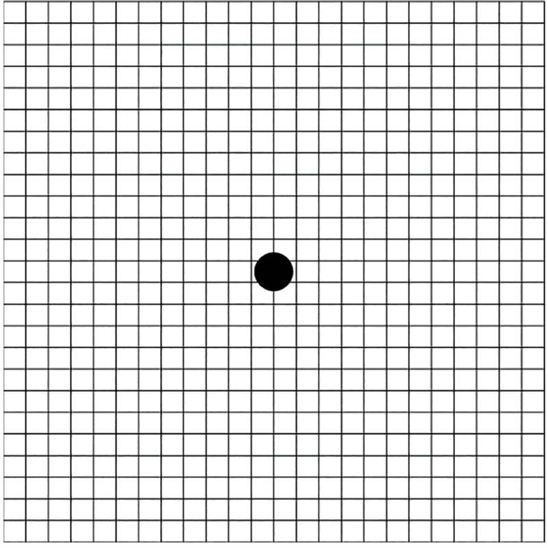 Pour dépister la DMLA, il est recommandé de tester régulièrement sa vision œil par œil (cacher un œil puis l’autre), fixer le point central et chercher des déformations des lignes ou la présence de taches.