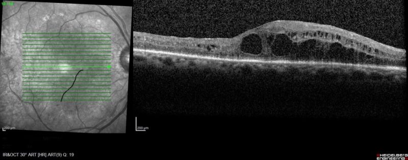 - Traitement au laser Argon de la rétine périphérique : panphotocoagulation rétinienne (le but de ce traitement est de stabiliser la perte d’acuité visuelle)